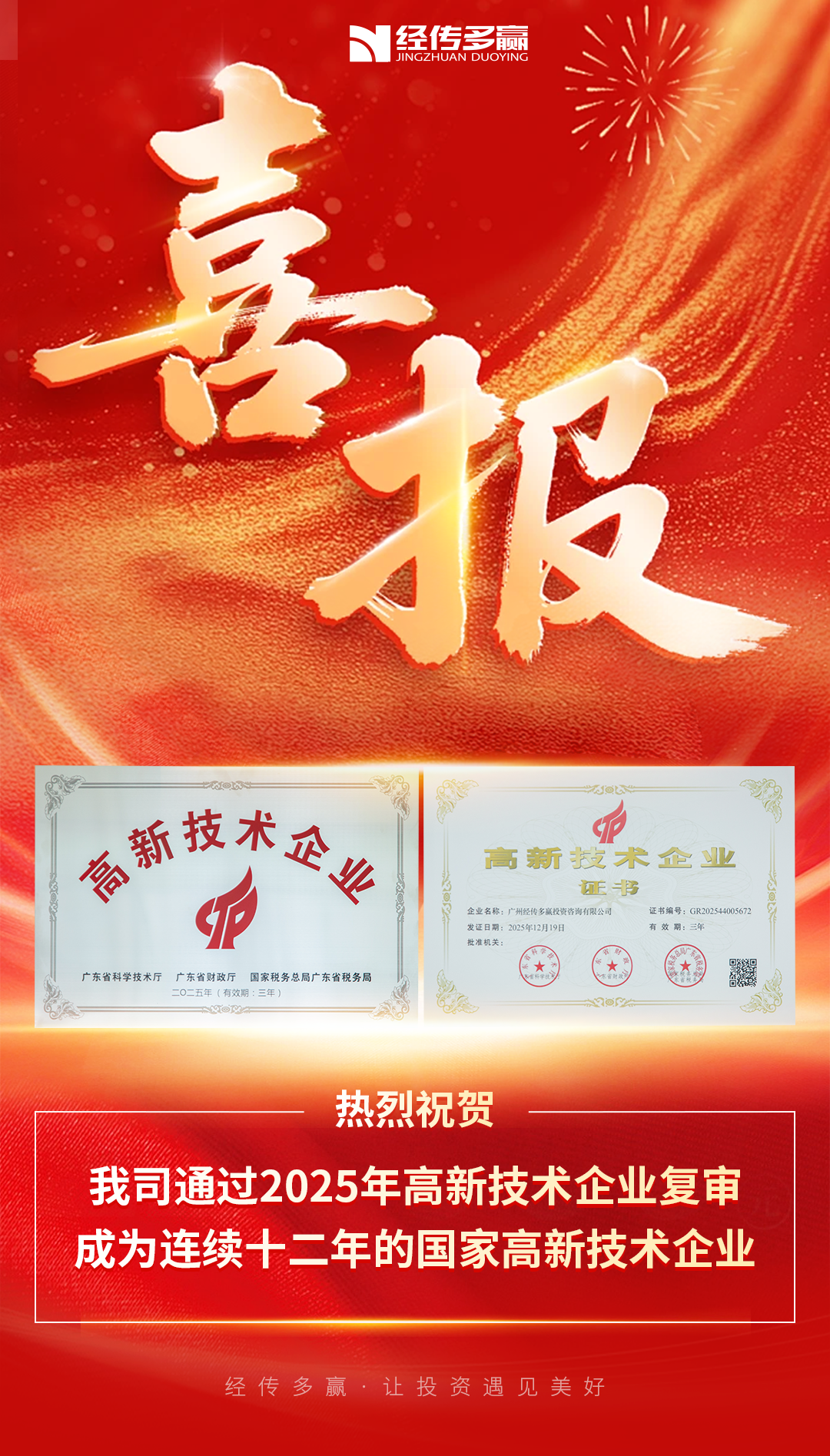 近日,广州经传多赢投资咨询有限公司(以下简称“经传多赢”)再度通过国家高新技术企业认定,成为国内金融信息服务领域罕见的“十二连冠”企业。这一资质不仅是对经传多赢技术实力的官方背书,更标志着其在金融科技赛道中构建了长期、稳定、可验证的创新护城河。