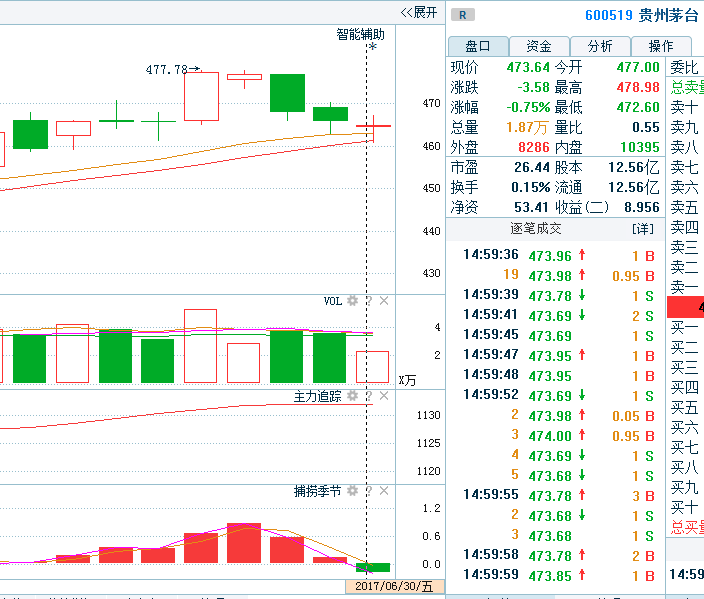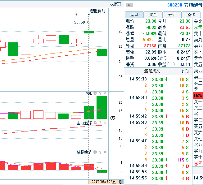 如上图十字光标对应走势显示,30日那天安琪酵母受半年报预披露影响直接大幅高开,最后是高开冲高回落收假阴线的。可以看出安琪酵母的业绩不及市场预期,被市场理解为利空,所以走出高开低走的走势,这显示大资金对白马股业绩是否达预期表示担心而出现犹豫,所以在6月30日这天虽然从个股的指标条件看是可以买,但是通过板块内个股的联动分析就不会买,这样就能弥补单一指标分析的不足。