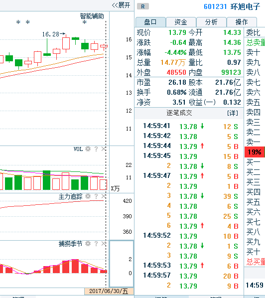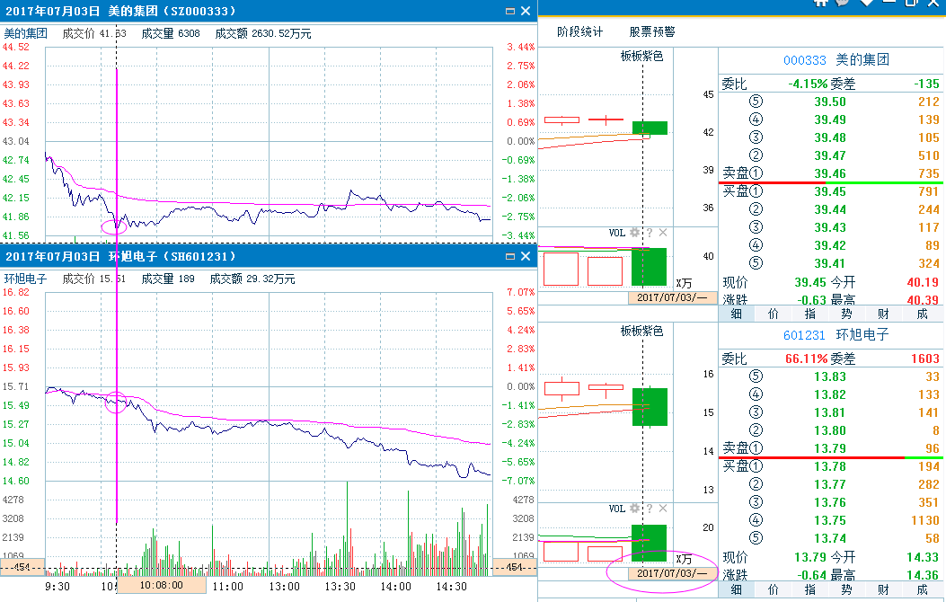 第二天(7月3日)安琪酵母直接大幅低开5%,当天贵州茅台、美的集团、中兴通讯等白马股开盘后快速走低,这时环旭电子还只是小幅下跌1%,如果在30日那天已经买入环旭电子,那第二天应及时止损,这样能规避大幅亏损。如下图: